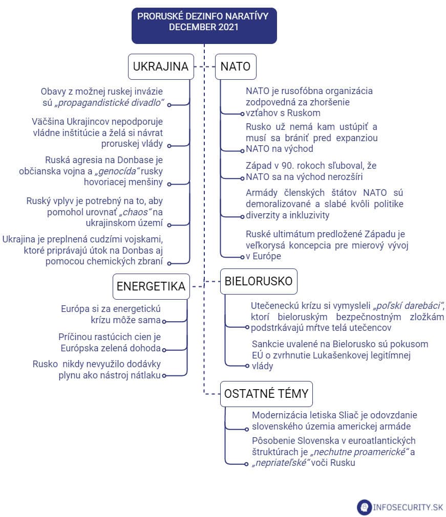 Ťažiskovou témou decembra bolo dianie na Ukrajine. V uplynulých týždňoch sme mali možnosť sledovať silnejúcu prokremeľskú rétoriku namierenú proti Ukrajine a NATO. Kým Rusko stupňovalo tlak na hraniciach, slovenské dezinformačné weby podporovali prokremeľské naratívy.