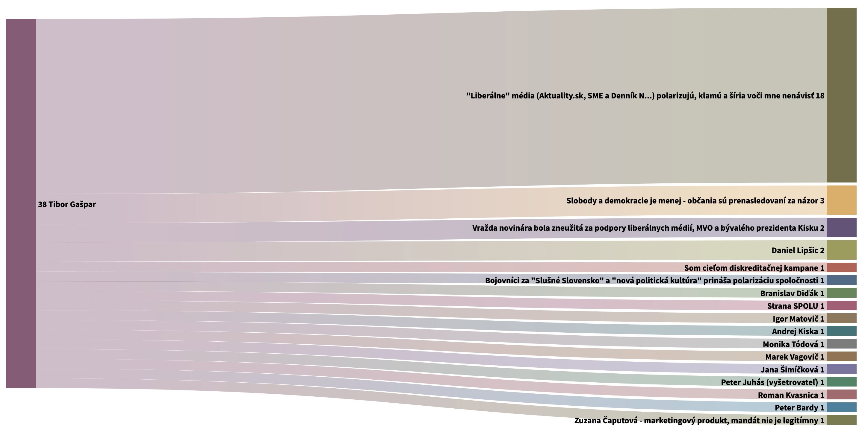 Metodológia: Vo vizualizácii sú zahrnuté všetky texty z Facebookovej stránky Tibora Gašpara od 29.7. vrátane. Kategórie v grafe reprezentujú zmienky o problémoch, ktorým pán Gašpar podľa vlastného úsudku musí čeliť a ľudia, resp. inštitúcie, ktoré za tieto problémy viní. Za jednu zmienku považujeme každý výskyt slova (napr. „médiá“), zloženého slova (napr. „Denník SME“) resp. ich synonymá („liberálne médiá“).