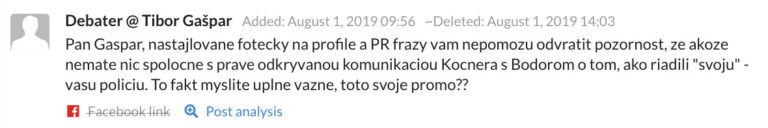 Tibor Gašpar však svoju facebookovú stránku nespravuje osobne. Dnes vieme, že jej administrátorom je Roman Vereš z reklamnej agentúry Chillix.