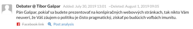 Najneskôr začiatkom roku 2019 sme si mohli všimnúť prienik naratívov z kedysi-periférie „divných webov“ dezinformátorov do hlavnoprúdovej politiky. Do svojej politickej komunikácie ich postupne zapracovávajú predseda parlamentu Danko, predseda SMERu Fico a mnoho iných. Tibor Gašpar sa iba rozhodol zviesť na vlne politickej komunikácie hráčov, ktorí krajine neponúkajú konštruktívne riešenia, no napriek tomu si nárokujú na prístup ku zdrojom štátu.