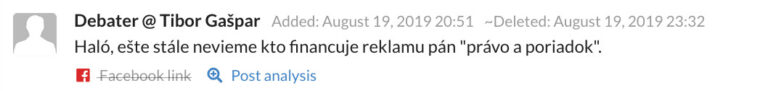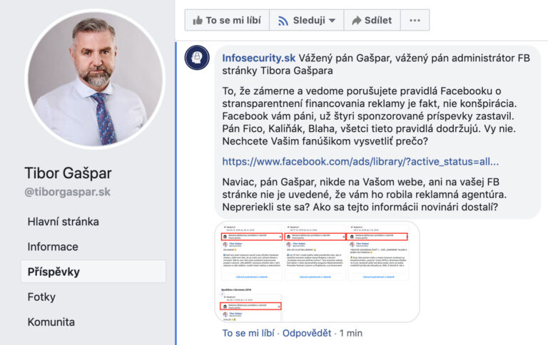 Tibora Gašpara sme niekoľko týždňov opakovane upozorňovali, že porušuje pravidlá sociálnej siete a najmä, že pred verejnosťou úmyselne tají, kto jeho reklamu financuje. Naše komentáre boli administrátorom systematicky odstraňované. Na súkromnú správu nereagoval.
