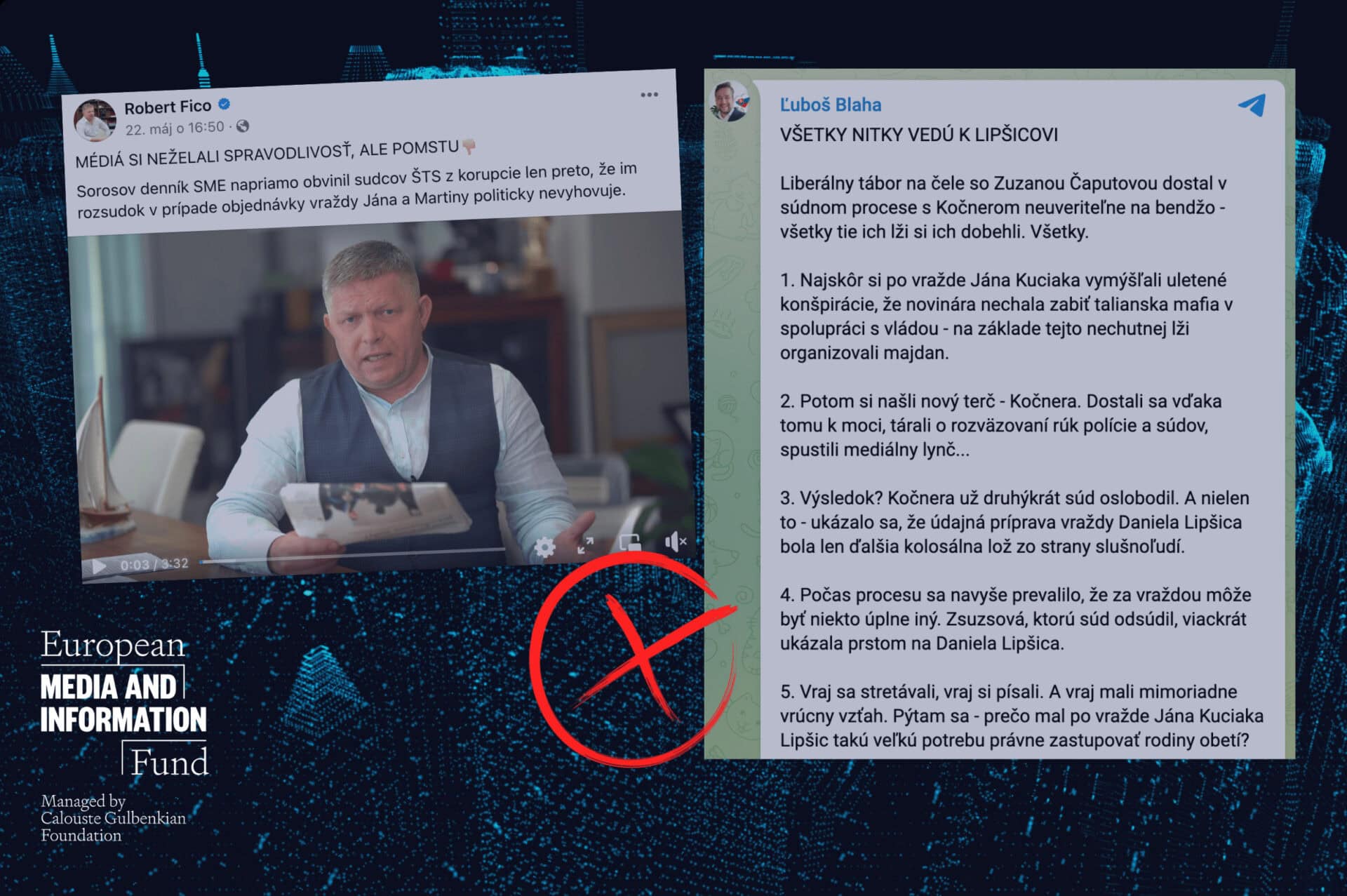 Predstavitelia strany SMER – SSD o vražde dezinformujú dlhodobo. Od začiatku sa stavajú do role obetí sprisahania zorchestrovaného v zahraničí. Na sociálnych sieťach pravidelne a systematicky očierňujú a spochybňujú slovenskú justíciu, vyšetrovateľov, vládu, prezidentku a pri akejkoľvek kritike hovoria o útokoch na opozíciu. Ich vyjadrenia často obsahujú absurdné konšpirácie bez akýchkoľvek dôkazov, čo vedie k chaosu v informačnom priestore, polarizácii spoločnosti a ohrozeniu demokracie a právneho štátu na Slovensku.