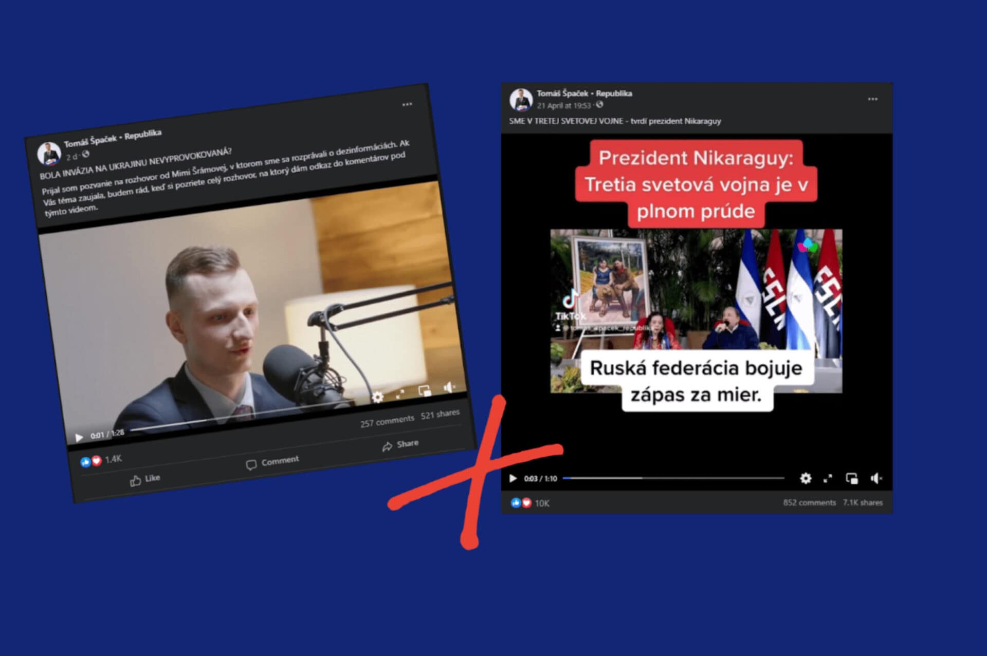 Tomáš Špaček, člen strany Republika, ktorý sa dostal do povedomia širokej verejnosti kvôli propagácii dezinformácií na svojom profilovom účte na Facebooku, šíril počas rozhovoru s Mimou Šramovou na portáli YouTube konšpiračné teórie. Týkali sa najmä vyšetrovania zločinov v Buči ako aj „nacistického“ režimu na Ukrajine.