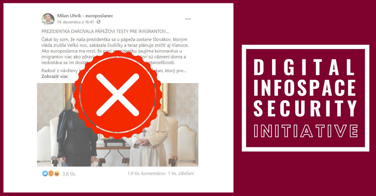 Europoslanec za ĽSNS Milan Uhrík sa snaží vo svojom príspevku navodiť dojem, že slovenská prezidentka Zuzana Čaputová preferuje migrantov na úkor Slovákov. Toto tvrdenie odvodzuje z jej stretnutia s pápežom Františkom. Odvoláva sa pritom na slová vedca Pavla Čekana, ktorého PCR testy odovzdala prezidentka pápežovi ako dar. Tieto testy majú byť určené pre utečencov, ktorým Vatikán poskytuje pomoc.