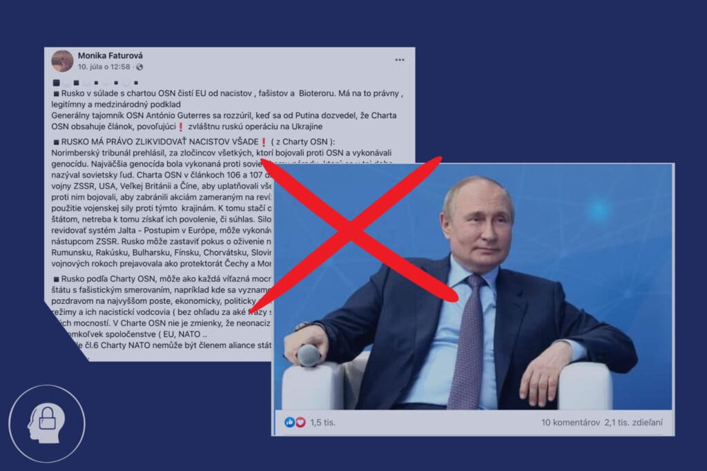 Na Facebooku sa šíri príspevok, podľa ktorého je ruská vojna na Ukrajine v súlade s Chartou OSN. Príspevok, ktorý má tisícky interakcií (reakcie, komentáre a zdieľania), sa odvoláva na články 106 a 107 Charty OSN. Autor príspevku tvrdí, že Rusko môže vojensky „zasiahnuť voči ktorémukoľvek štátu s fašistickým smerovaním, napríklad kde sa vyznamenávajú nacisti, zdraví sa nacistickým pozdravom na najvyššom poste, ekonomicky, politicky a morálne sa podporujú neonacistické režimy a ich nacistickí vodcovia“. Články sú však v dnešnej dobe prekonané a na ospravedlnenie vojny na Ukrajine by sa ani v teoretickom prípade nedali využiť. Viac v článku.
