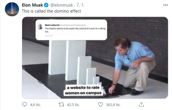 Musk v tweete prirovnal útok na Kapitol k dominovému efektu. K tweetu pridal aj meme, ktoré jeho prirovnanie k dominu vysvetľuje. Na jednej strane je ten najmenší kúsok, s nápisom „stránka, kde sa hodnotí, ktoré študentky sú sexy, a ktoré nie,“ a na opačnej strane zase ten najväčší, pomenovaný „Kapitol ovládol muž v kostýme Vikinga“. To, čo je medzi nimi, predstavuje postupný vývoj Facebooku v stránku, ktorá či už úmyselne alebo neúmyselne, podporuje nenávisť a násilie.